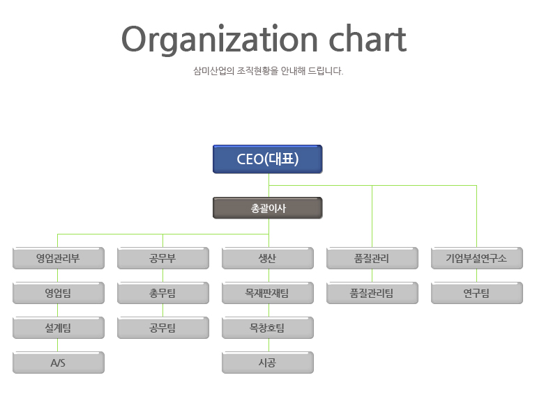 회사소개 CEO인사말 회사개요 조직도 오시는길 제품소개 목창호 가구 인테리어 목재데크제 사업분야 사업영역 시공실적 시공갤러리 나라장터쇼핑몰 목재문 목재창 목재판재 플로어링블록 플로어링보드 E-카달로그 고객센터 공지사항 Q&A 고객제안